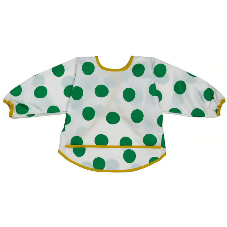 | Нагрудник виглядає яскраво і привабливо — біле тло із зеленими горошинами робить його веселим та дитячим, а жовта окантовка додає контрасту. Він візуально акуратний, виглядає охайно та стильно, відмінно підійде як для малюків будинку, так і для використання у дитячих закладах. |